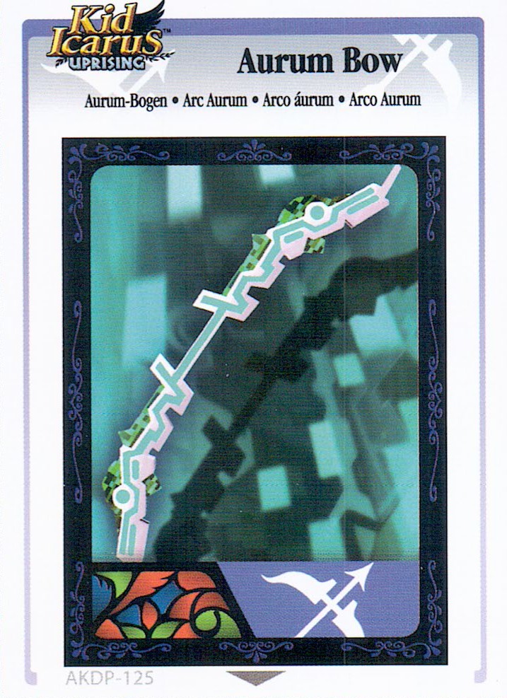 Aurum Bow is an AR Card that was available in the second series of Kid Icarus: Uprising Booster Packs. By scanning the card to a copy of Uprising, the player will receive an Idol of a Aurum Bow, as well as 100 Hearts.
