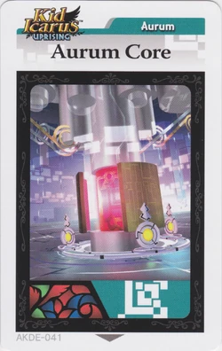 Aurum Core is an AR Card that was available in the second series of Kid Icarus: Uprising Booster Packs. By scanning the card to a copy of Uprising, the player will receive an Idol of the Aurum Core, as well as 100 Hearts.