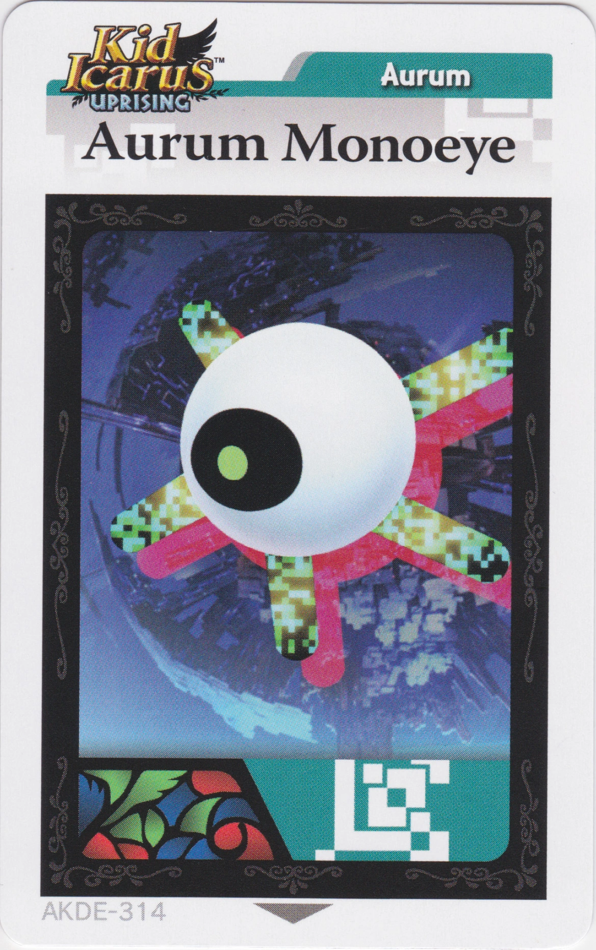 Aurum Monoeye is an AR Card that was available in the second series of Kid Icarus: Uprising Booster Packs. By scanning the card to a copy of Uprising, the player will receive an Idol of an Aurum Monoeye, as well as 100 Hearts.