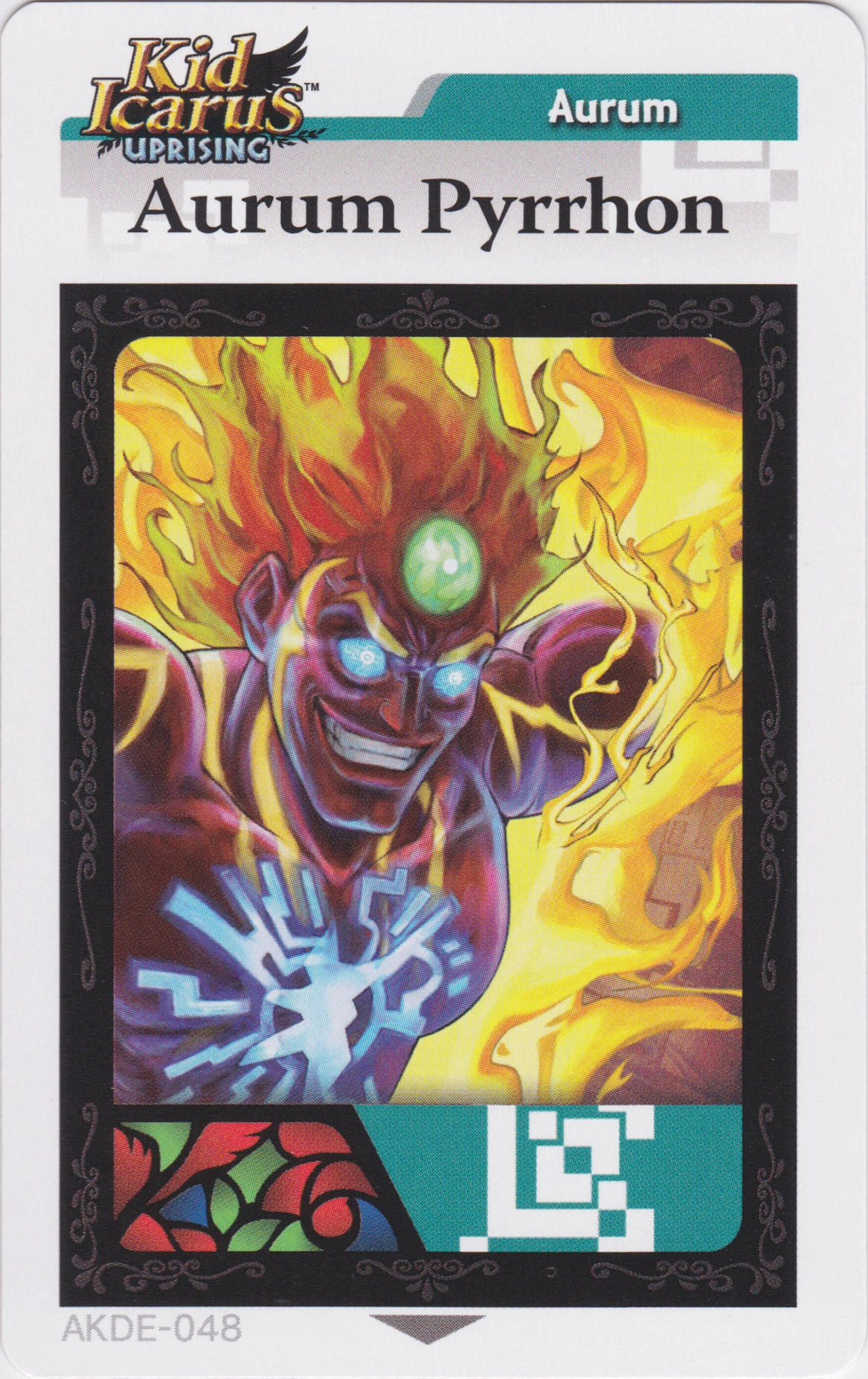 Aurum Pyrrhon is an AR Card that was available in the second series of Kid Icarus: Uprising Booster Packs and the official Prima strategy guide for the game. By scanning the card to a copy of Uprising, the player will receive an Idol of Aurum Pyrrhon, as well as 100 Hearts.