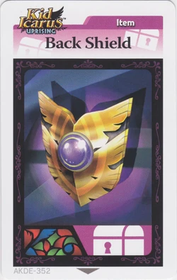 Back Shield is an AR Card that was available in the second series of Kid Icarus: Uprising Booster Packs. By scanning the card to a copy of Uprising, the player will receive an Idol of a Back Shield, as well as 100 Hearts.