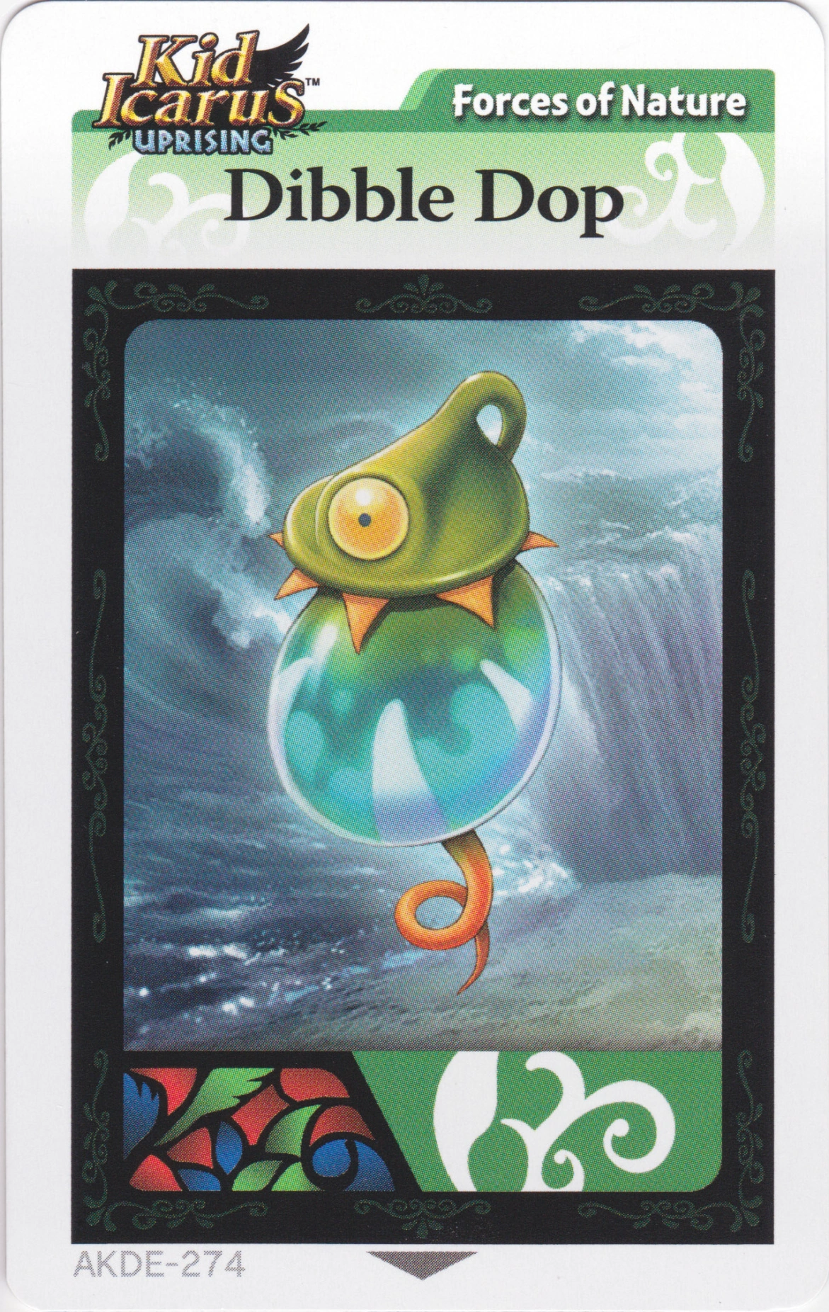 Dibble Dop is an AR Card that was available in the second series of Kid Icarus: Uprising Booster Packs. By scanning the card to a copy of Uprising, the player will receive an Idol of a Dibble Dop, as well as 100 Hearts.