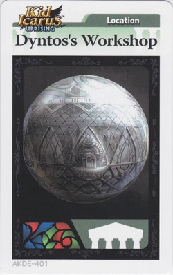 Dyntos's Workshop is an AR Card that was available in the second series of Kid Icarus: Uprising Booster Packs. By scanning the card to a copy of Uprising, the player will receive an Idol of Dyntos's Workshop, as well as 100 Hearts.