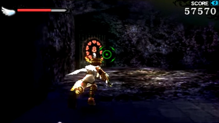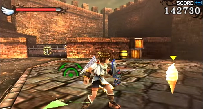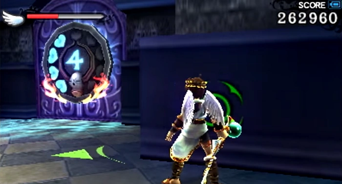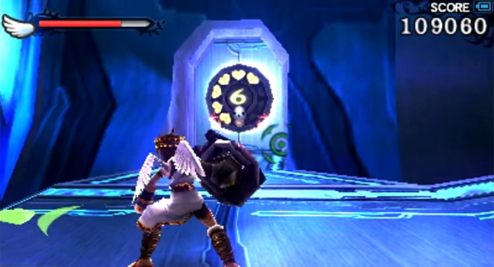 This Intensity Gate is found directly to the right of the fountain. Because this is the first Intensity Gate that Pit finds, Palutena will fill him in on what it is. Inside are a Crawler and two Gyrazers which must be defeated in order for a Treasure Box and some food to appear.