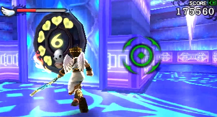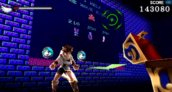 In the area with trampolines, where Pit encounters the second Specknose, he can drop down beneath the platform it is found on to reveal the level 8 Intensity Gate. Inside the gate is a single Treasure Box. As an easter egg, the room is textured to look like a store from the original Kid Icarus.