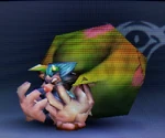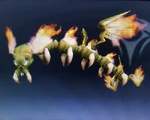 NTSC: While Palutena's mighty catapults aren't strictly alive, they are able to think and react on their own. They feed rocks from atop their heads into launchers, which hurl them at the foe like a pitching machine. PAL: While Palutena's mighty catapults aren't strictly alive, they are able to think and react on their own. They feed rocks from atop their heads to the two launchers at either end of their bodies, which hurl them at the foe like a pitching machine. |