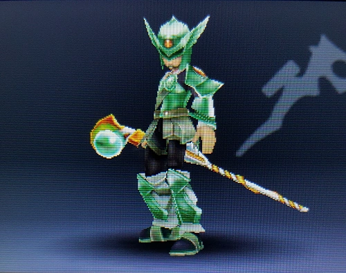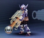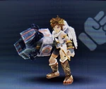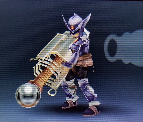 NTSC: The horizontal stock crossing the barrel is packed with a substance that generates this weapon's wide-ranged shots. These shots have the strong potential for nullifying enemy fire, and the weapon's weight makes its melee attacks powerful. PAL: The horizontal stock crossing the barrel is packed with a substance that generates this weapon's wide-ranged shots. These shots have strong potential for nullifying enemy fire, and the weapon's weight makes its melee attacks powerful. |