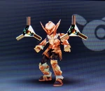 While the Burst Blade has lower attack power and has the shortest range of any blade, it also fires multiple bullets at once, giving it a wide attack. Its ranged attacks have a strong potential of nullifying incoming fire. | Idol Toss, AR Card | |