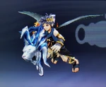 Being Pit's copy, Dark Pit was originally incapable of flight. However, he gains the ability when he absorbs Pandora's remaining power into his wings. And while he may not need help flying, he still shares a bond with his counterpart. | AR Card | |
