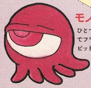 In the original Kid Icarus, the Monoeye is a pink, round monster with a single pink eye and multiple tentacles protruding from its backside.