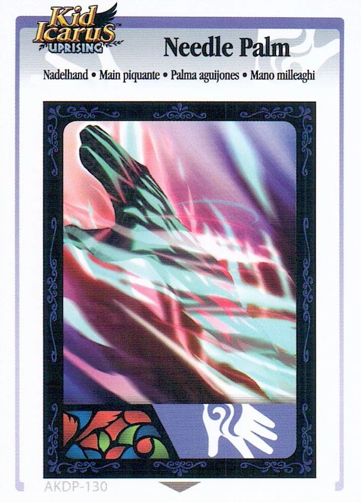 Needle Palm is an AR Card that was available in the first series of Kid Icarus: Uprising Booster Packs. By scanning the card to a copy of Uprising, the player will receive an Idol of the Needle Palm, as well as 100 Hearts.