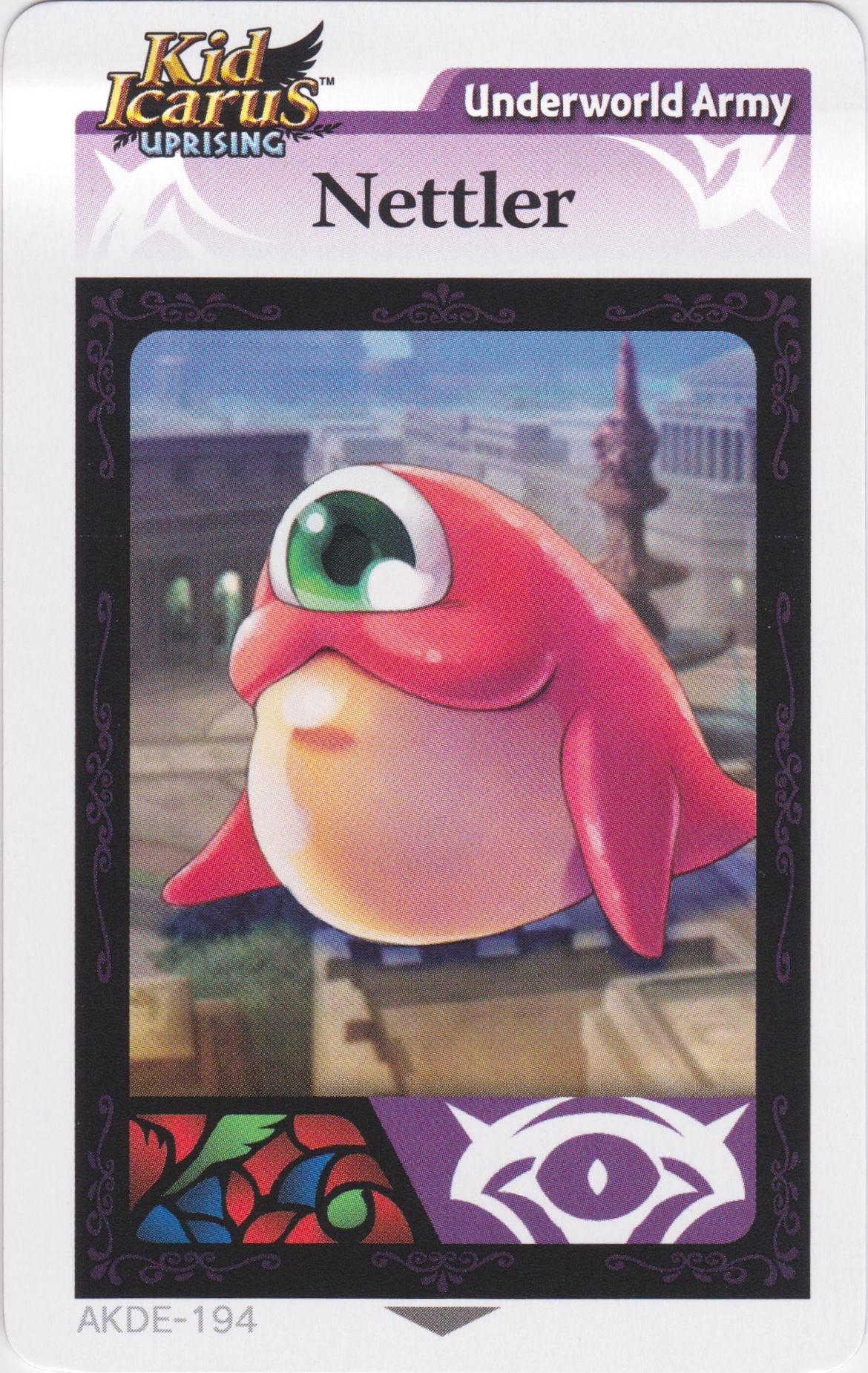 Nettler is an AR Card that was available in the first series of Kid Icarus: Uprising Booster Packs. By scanning the card to a copy of Uprising, the player will receive an Idol of the Nettler, as well as 100 Hearts.
