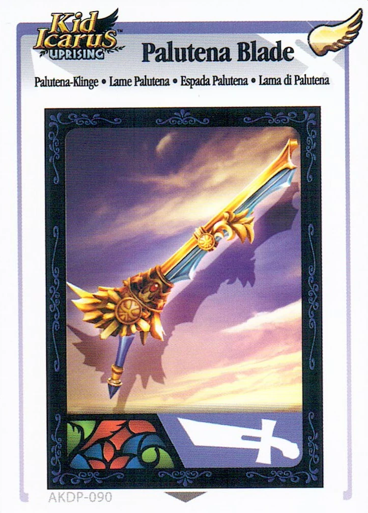 Palutena Blade is an AR Card that was available in the second series of Kid Icarus: Uprising Booster Packs. By scanning the card to a copy of Uprising, the player will receive an Idol of a Palutena Blade, as well as 100 Hearts.