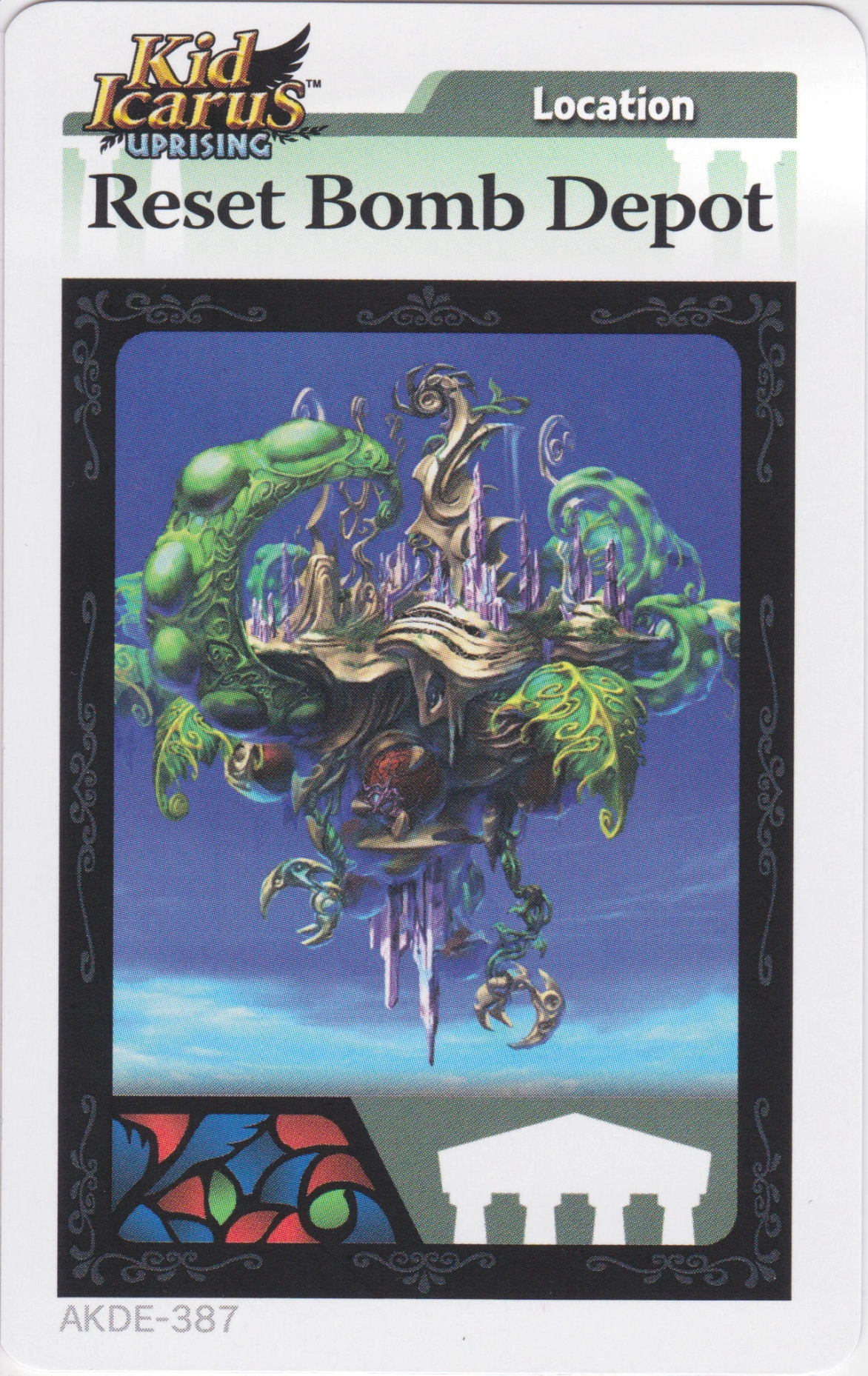 Reset Bomb Depot is an AR Card that was available in the second series of Kid Icarus: Uprising Booster Packs. By scanning the card to a copy of Uprising, the player will receive an Idol of the Reset Bomb Depot, as well as 100 Hearts.