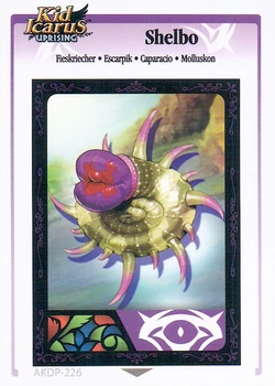 Shelbo is an AR Card that was available in the first series of Kid Icarus: Uprising Booster Packs. By scanning the card to a copy of Uprising, the player will receive an Idol of a Shelbo, as well as 100 Hearts.