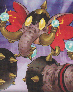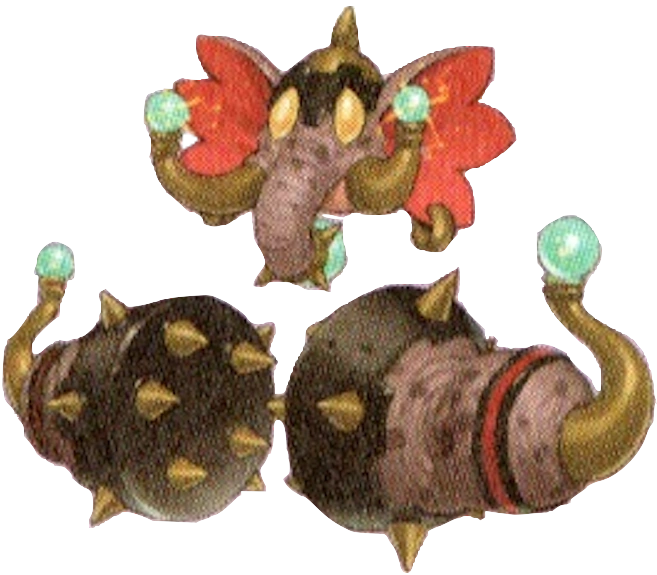 The Snong is a monster resembling a brown, disembodied elephant head with disembodied two limbs and red colored inner ears. It possesses a gold and black hat, which matches its gold tusks, earrings, spiked collar at the end of its trunk, handle-like appendages on its limbs, and numerous spikes at the bottoms of its limbs. It has blank yellow eyes, and at the tips of its trunk, tusks, and legs, it possesses light blue orbs that appear to conduct electricity. It also has red and black spikes on its limbs.