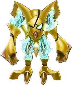 Space Pirates are stocky, vaguely insectoid creatures, most notable for their yellow, armor-like exoskeletons. This armor serves to protect the glowing interiors of their bodies, with their organic limbs visible between segments. The center of their armors also possess what appears to be a face, featuring a single left eye and a mouth piece with two slits built in to allow for vocal communication.