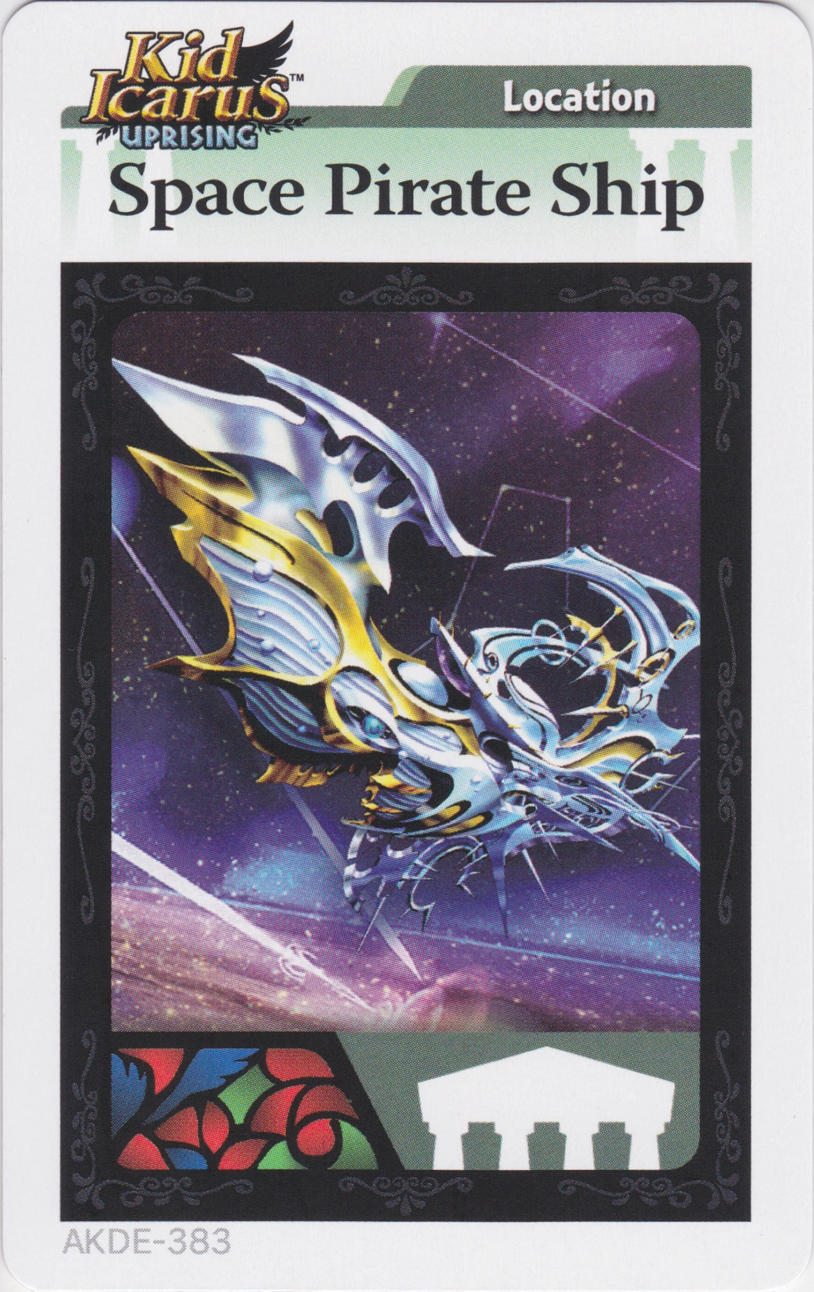 Space Pirate Ship is an AR Card that was available in the second series of Kid Icarus: Uprising Booster Packs. By scanning the card to a copy of Uprising, the player will receive an Idol of the Space Pirate Ship, as well as 100 Hearts.