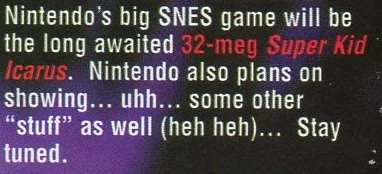 - ↑ "Super Play No. 20, June 1994". June 1994. p. 73. "I'd like to see a Super Nintendo version of Kid Icarus, that great NES game from yesteryear. That's it really." - Matthew Fleetwood, Cheshire. Super Play: "You're in luck. A SNES Kid Icarus game will be unveiled at either the Summer CES in June, or the Winter CES next January. The game isn't set to be released until early 1995, though."