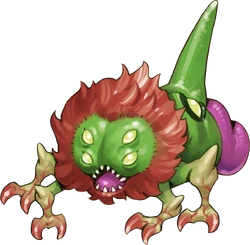 The Trailtail is a green, insect-like monster with four legs. It possesses four yellow eyes on its face, along with a gaping mouth filled with sharp teeth and a red mane. Its two yellow marks on its back, along with its single protruding spike and purple spinneret, gives its rear the appearance of a humanoid face.