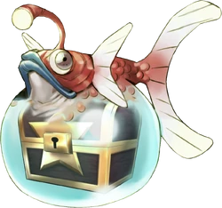 The Treasurefish is a red fish with white fins and gray eyes. It has blue lips, a luminescent lure atop its head, and a large air sac beneath it that contains a Treasure Box.