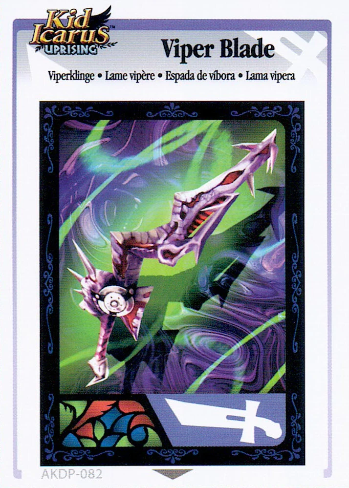 Viper Blade is an AR Card that was available in the first series of Kid Icarus: Uprising Booster Packs. By scanning the card to a copy of Uprising, the player will receive an Idol of Viper Blade, as well as 100 Hearts.