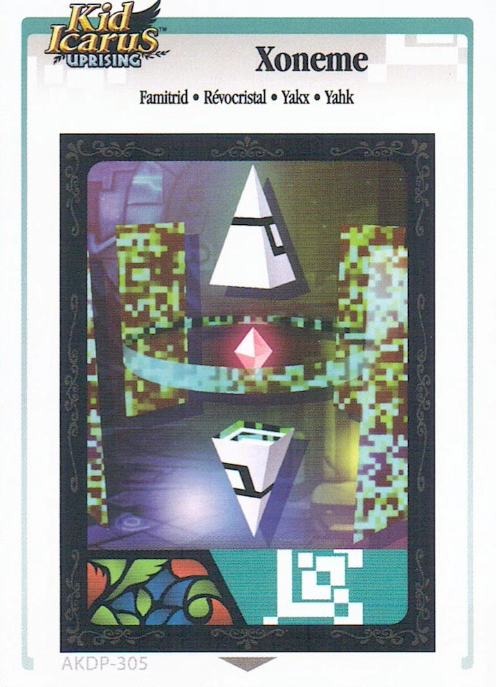 Xoneme is an AR Card that was available in the second series of Kid Icarus: Uprising Booster Packs. By scanning the card to a copy of Uprising, the player will receive an Idol of a Xoneme, as well as 100 Hearts.